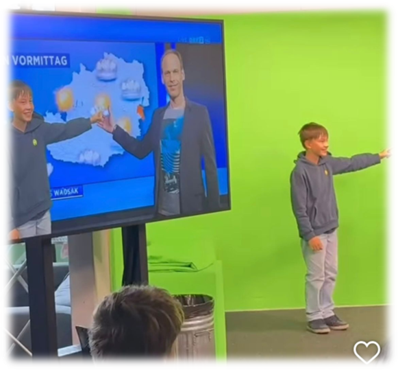 Ein besonderes Highlight war die Screenbox, in der die Kinder selbst in die Rolle von Wettermoderatorinnen und Nachrichtensprechern schlüpfen konnten. Mit viel Begeisterung probierten sie sich im Vortragen von Wettermeldungen und Nachrichten – eine Erfahrung, die nicht nur Spaß machte, sondern auch einen Eindruck von der Professionalität und Vorbereitung vermittelte, die hinter solchen Sendungen steckt.